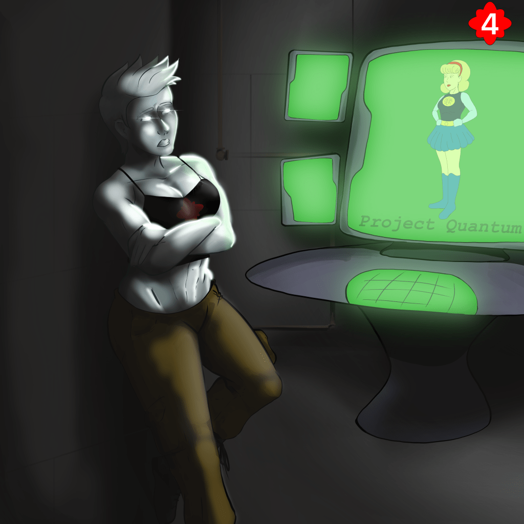 As with all my Supergirl in the Multiverse posts, this is my own artwork and it depicts Bombshell on the left leaning against a wall with her arms crossed. In the background on the right is a computer screen reading “Project Quantum” and depicting my take on what Bombshell might have looked like if she had appeared in Charlton Comics alongside Captain Atom. A motif in the top right shows the Bombshell symbol and a 4 on top of it.