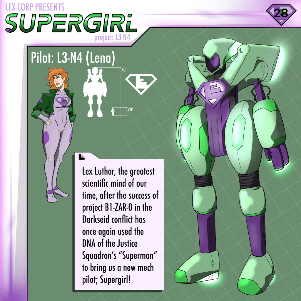 Supergirl does not show up in the pages of DC Mech and because of how severely the destruction of Krypton is shown, it doesn’t seem like any Kryptonians aside from Kal could have escaped to Earth. However the story does include a Bizarro character that was made by Lex creating a clone from Superman’s blood. With this in mind, I pulled together an idea based somewhat on the post-Crisis Matrix Supergirl and Lena Luthor II. The Matrix Supergirl was made by the pocket universe Lex and Lena II was the daughter of New Earth’s Lex so that’s the sort of relationship between L3-N4 and Lex. Lex-Corps Supergirl is meant to be a competitor to the Justice Squadron and seen more as Luthor’s own answer to protecting earth from extra-human threats.