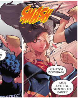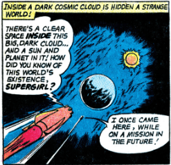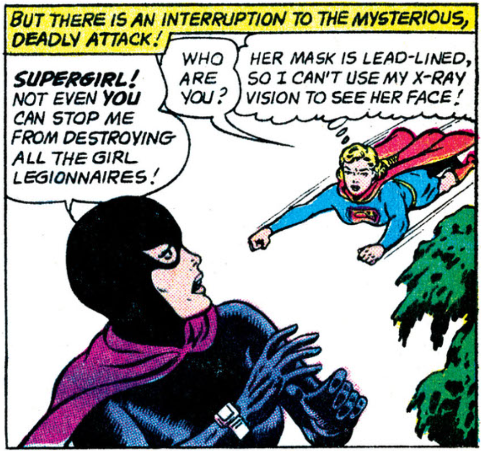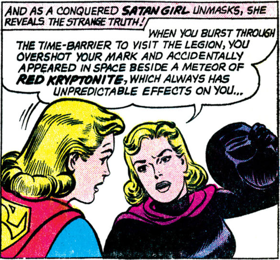 It is here that Supergirl and Satan Girl confront one another for the first time and Supergirl notices that her foe wears a lead-lined mask to conceal her identity from anyone with x-ray vision. While her power set matches her with beings of both Krypton and Daxam, having a lead-lined mask confirms to Supergirl that this foe must be from Krypton since lead is fatal to Daxamites. The 2 girls have a brief tussle and Supergirl tries using her heat vision to melt the lead mask of her foe to find out the identity of this mystery Kryptonian. Satan Girl seeing through this plan quickly maneuvers away from the girl of steel and escapes. However, Supergirl has a new plan involving a certain radioactive green rock. Supergirl, now Kryptonite in hand (in a protective lead box of course), tracks Satan Girl to an asteroid hideout when Supergirl ambushes her with the Kryptonite when she is dumbfounded to see had no affect on her adversary. Satan Girl is easily able to flee from Supergirl to continue carrying out her nefarious deeds.
