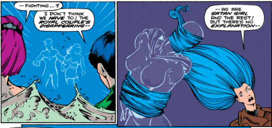 Satan Girl bursts onto the scene leading a Legion of Supervillains who then attack this combined Legion mostly as a distraction while Glorith and Mordru capture the elder Rokk Krinn who, in his unstable condition, was attacking the Legion at the start of the issue.