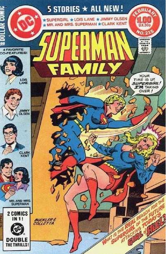 As we continue movie forward, Superman Family #215 from early 1982 has a cover featuring the Supergirl of the Future attacking our maiden of might. Throughout the story it is revealed that this is a Supergirl from the 5020th century that has come to the past to assist in the capture of one of her villains (also from the future) named Tal Belok and his 20th century companion Toxus. The antagonistic nature of this future girl of steel that is shown on the cover is only due to confusion and the pair quickly work together. However, by the end of the story after the villains are subdued once more, our present day heroine must be hypnotized lest her knowledge of the future cause turmoil to the present.