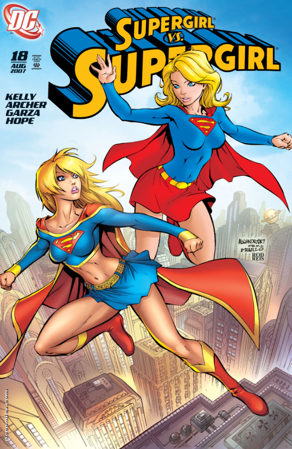 Coming in just a year later we get a new Supergirl vs Supergirl story in issue #18 of the title. If this cover looks familiar, that’s because its a clear homage to the one we looked at before, issue #5. While the cover matches issue 5, the story also has some similarities to the Many Happy Returns storyline we discussed before that. In this issue Supergirl is having halucinations and struggling to fight the urges inside her to kill Superman. All while this is happening we’re introduced to a very happy-go-lucky Supergirl that once again seems to resemble the pre-crisis version. After a bit of fighting and the “perfect” Supergirl trying to convince Kara that she’s not the real Supergirl, our hero overcomes and it’s revealed that everything she’s been through has been the result of Dark Angel. Dark Angel had been sent by the Monitors to track down potential anomalies in the new post Infinite Crisis world and test them to see if they’re really supposed to be in this universe or not. Our hero does pass the test and a Monitor tells her that the information she’s come to know about her life on Krypton and what she knew of Zor-El was all fake and she wasn’t actually sent to earth to kill her cousin.