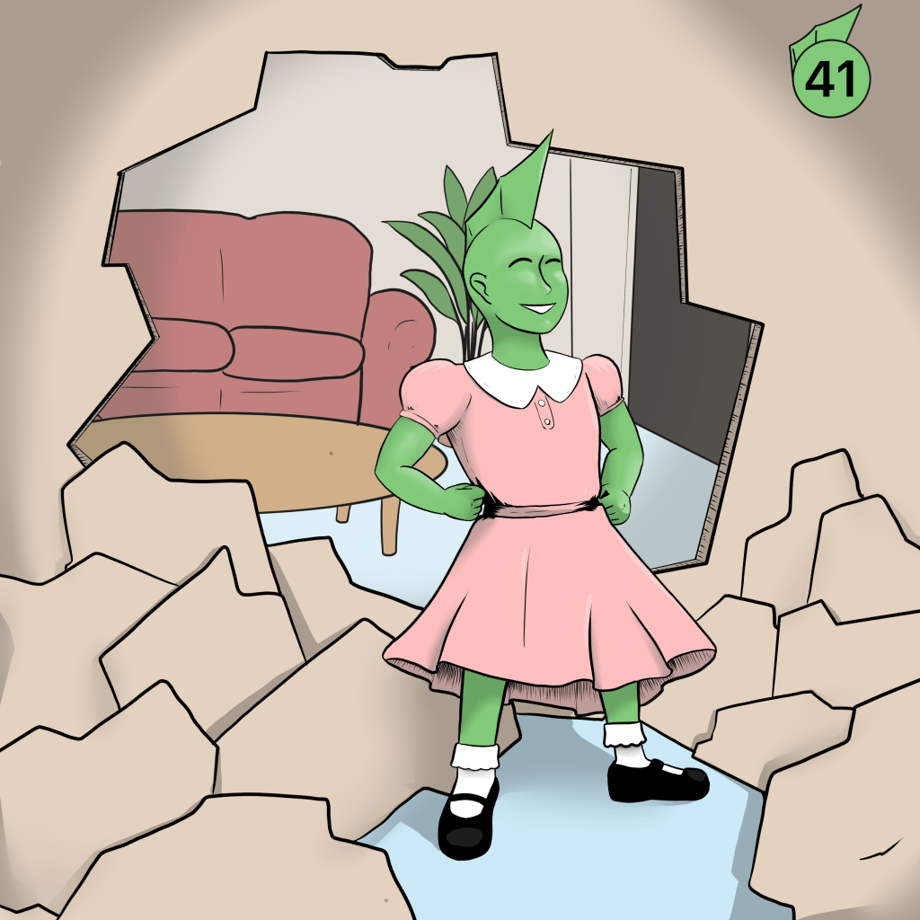 As with all my Supergirl in the Multiverse posts, this is my own artwork. Amy Dragon is shown in the foreground with her hands on her hips and a large smile across her face. A large hole in a wall almost definitely caused by Amy, is behind her with rubble piled up all around her. A room with a couch can be seen through the hole. The top right features a green circle with a fin representing the Dragon family with a 41 on top of it.