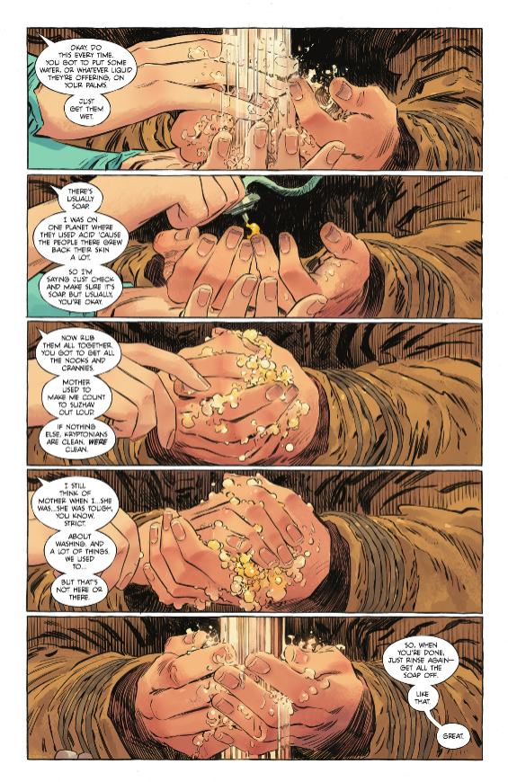 A lot of my favorite moments from this story can be described as Supergirl seeing someone in need and helping them in a personal and specific way. The story is galaxy spanning and we see numbers of different planets and locations and it’s obvious Supergirl and Ruthye travel together for quite a while, but the story really is a very small and personal journey about Ruthye tracking down Krem. There is no doubt throughout the story that Supergirl cares for Ruthye, sometimes it’s shown with a firm fist to an unwanted bus passenger, sometimes its a strict denial when telling Ruthye what to do, but my favorite way we see care shown is in the soft moments. Ruthye isn’t familiar with a piggyback ride, but Supergirl gently walks her through it it helps reassure her of the safety. Early on in the story, but still after months of traveling, Supergirl realizes that Ruthye has no idea how to wash her hands. From the first time reading this scene, this has been my favorite moment of the whole story. There is such a care shown from Supergirl in this scene, and she treats the situation so gently. Lines like “Mother used to make me count to suzhav out loud,” and “If nothing else, Kryptonians are clean. Were clean,” really say a lot in this scene. It’s this remembrance of Krypton that sets Kara apart from her cousin, and the specific dialogue here puts Kara in almost a motherly role to Ruthye here. There are a few moment in issue 4 where we see this soft compassion show but another of my favorite moments is when the pair land on Tillus, a planet that had been ravaged by the Brigands. Where they land there’s a single person shown with the duty of digging dozens, possibly hundreds, of graves for all those lost to the Brigands. Through dialogue we learn both that this task has to be done by sundown to prevent the need for a mass grave, and also that his daughter is one of those lost. Supergirl asks him if she can help, and while he initially refused he does let her help. Supergirl not only finishes the task for him, she mentions that she isn’t perfect and may have made mistakes, and above all else she found his daughter and offers to take him to her grave. Later that issue we’re also shown that strict motherly nature, that I mentioned earlier when, Supergirl and Ruthye are on Tyrrrcoomn. This is a planet that kept very specific records and videos of the sheer brutality of the Brigands attack and when Ruthye tries to view the footage Supergirl responds; “You don’t have to see this, and I do, and if you don’t have to, you won’t. That’s the end of it.”