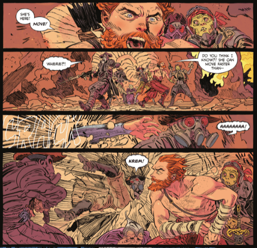 Ruthye Marye Knoll, a character introduced for this series and one that I mentioned is the focal point of the tale. She is the youngest of 7 and the only daughter born to a rock farm on a planet with a red sun. While Ruthye was literally raised in a barn, she seems to be well educated and speaks quite eloquently. She talks in the way that a 12 year old who reads a lot of books would. By this I mean she seems to have an extensive vocabulary, but doesn’t have a full grasp of the world. Ruthye has spent the entirety of her young life before meeting Supergirl knowing just of her rock farm. She had no idea of piggyback rides, alien life, or washing her hands. Upon finding her father’s dead body, Ruthye has one goal in mind; find Krem of the Yellow Hills and end his life. Throughout the story Ruthye is called stubborn, small, and soft but most of all she is just a girl. While Krem, and the Brigands, and any other foe they come across uses these facts to belittle her, Supergirl is also shown as such and she is still Super.