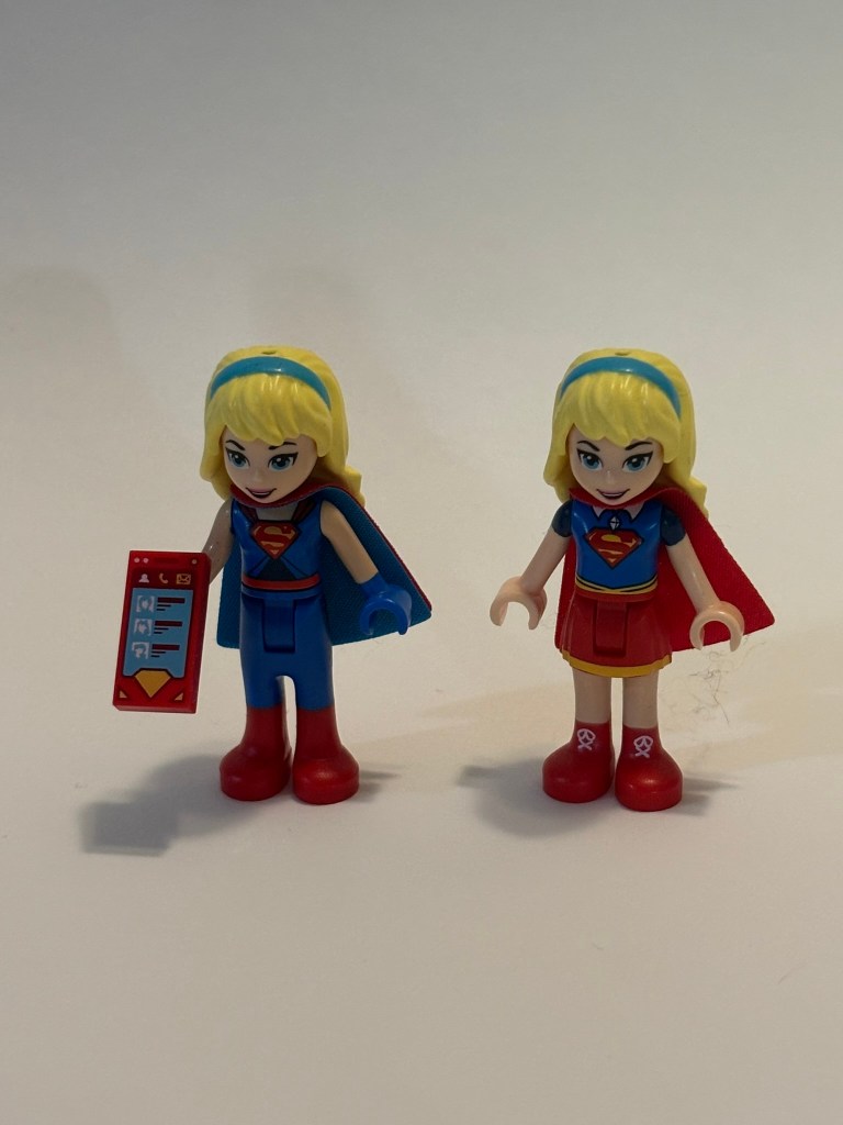 First up all our Hero Mini-Dolls. As you can see, some of the characters have different costumes, this is because these characters appeared in multiple sets. I will be referring to them as “A-Costumes” and “B-Costumes” where the A-Costume will be their main costume and the B-Costume will be a variant. Some of the characters also have little cellphone accessories that are fun little unique pieces exclusive to this line. First up is, of course, Supergirl! She first showed up in her A-Costume in 2016’s Super Hero High School (41232). Her B-Costume is from the next year’s Lena Luthor Kryptomite Factory (41238) and features a sleeveless costume and pants and a 2-color cape that is achieved by having both a red and a blue cape element included with the set. Batgirl is next, and if you count her NYCC appearance, she is the mini-doll with the most set appearances. Her A-Costume, with the black pants, is from Batgirl Batjet Chase (41230) and her B-Costume uses lighter purples (aside from her reused cowl from her A-Costume) and came with Batgirl Secret Bunker (41237). Wonder Woman seems to be the only one of the main 4 to not get a cellphone accessory but I may just be missing the piece. She shows up in her A-Costume in Wonder Woman Dorm (41235) and then later in a darker colored costume in Eclipso Dark Palace (41239). Our last figure with 2 variants is Harley Quinn. She first shows up in Harley Quinn to the Rescue (41231), and then in her pjs in Harley Quinn Dorm (41236). Poison Ivy would show up alongside Supergirl in Super Hero High School (41232). Bumblebee would get her own set in 2016, Bumblebee Helicopter (41234). Steve Trevor is the only civilian to show up in the series, and he shows up in his Capes & Cowls work uniform with Harley in Harley Quinn to the Rescue (41231). Flash, the second of 2 boy Mini-Dolls in the line, is part of the Eclipso Dark Palace (41239) set and features him without a mask on which seems bonkers to me. Last up for the hero team is Krypto who appears more than anyone else in 3 sets: Lashina Tank (41233), Krypto Saves the Day (30546), and Lena Luthor Kryptomite Factory (41238).
