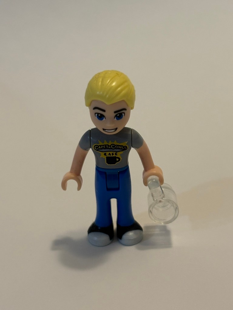 The Capes and Cowls Cafe features some cool elements including an arcade cabinet, a coffee maker, and a breakaway window. I want to talk instead about this custom printed 2×2 tile that seems to be mimicking a comic cover. I’ve not been able to pin down if this is supposed to be a direct comic reference or just a generic overall reference. The circle in the top left and the starburst behind the issue number has the same vibes as the Johnny DC line of comics from the early 2000s that targeted young audiences, titles like Tiny Titans and Supergirl: Cosmic Adventures in the 8th Grade were part of this line.