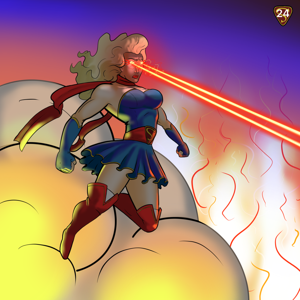 As with all my Supergirl in the Multiverse posts, this is my own artwork. For this post I mad a brief comic strip that explains Carrot Cutie’s origin. Three panels on the left have a brief dialogue between Rachel and Rodney as Rachel is looking for a snack until she is distracted by the carrots in Rodney’s windowsill. On the right, Rachel has now transformed into Carrot Cutie with a costume similar to Captain Carrot’s and in the background is Rodney’s artist studio where he works on his comic Just’a Lotta Animals. A motif in the top right features the Captain Carrot symbol with a 26 on top of it.